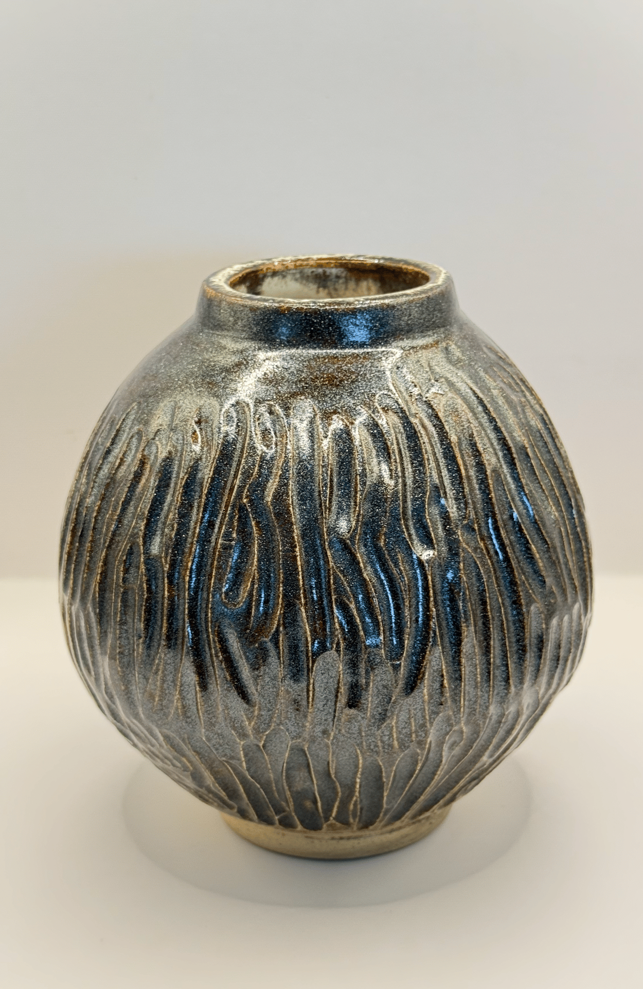 This hand-carved moon jar is glazed in deep brown-black with a subtle glittering sheen, inspired by the movement of water as it leaves the shore. The carved lines echo the little grooves formed in the sand when the tide recedes on a black-sand beach, creating flowing textures that shimmer like wet sand at dusk.
