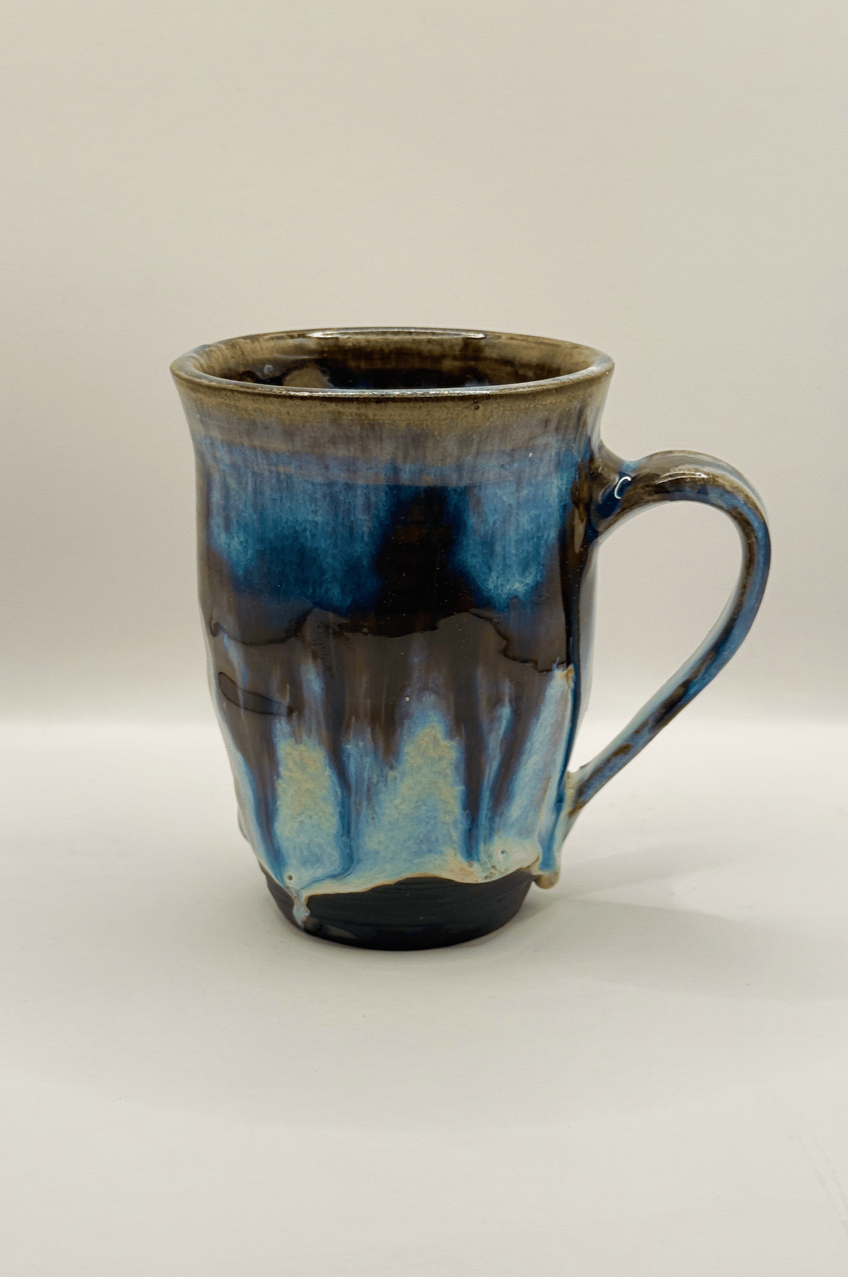 This handmade ceramic mug is crafted on black clay, with flowing glazes of inky black, ocean blue, and soft sandy tones cascading down the surface like deep-sea currents. The drips create a natural sense of movement, giving the piece tidal energy and depth. Inside, the glossy glaze shimmers with layered blue tones, echoing the shifting light beneath the waves.