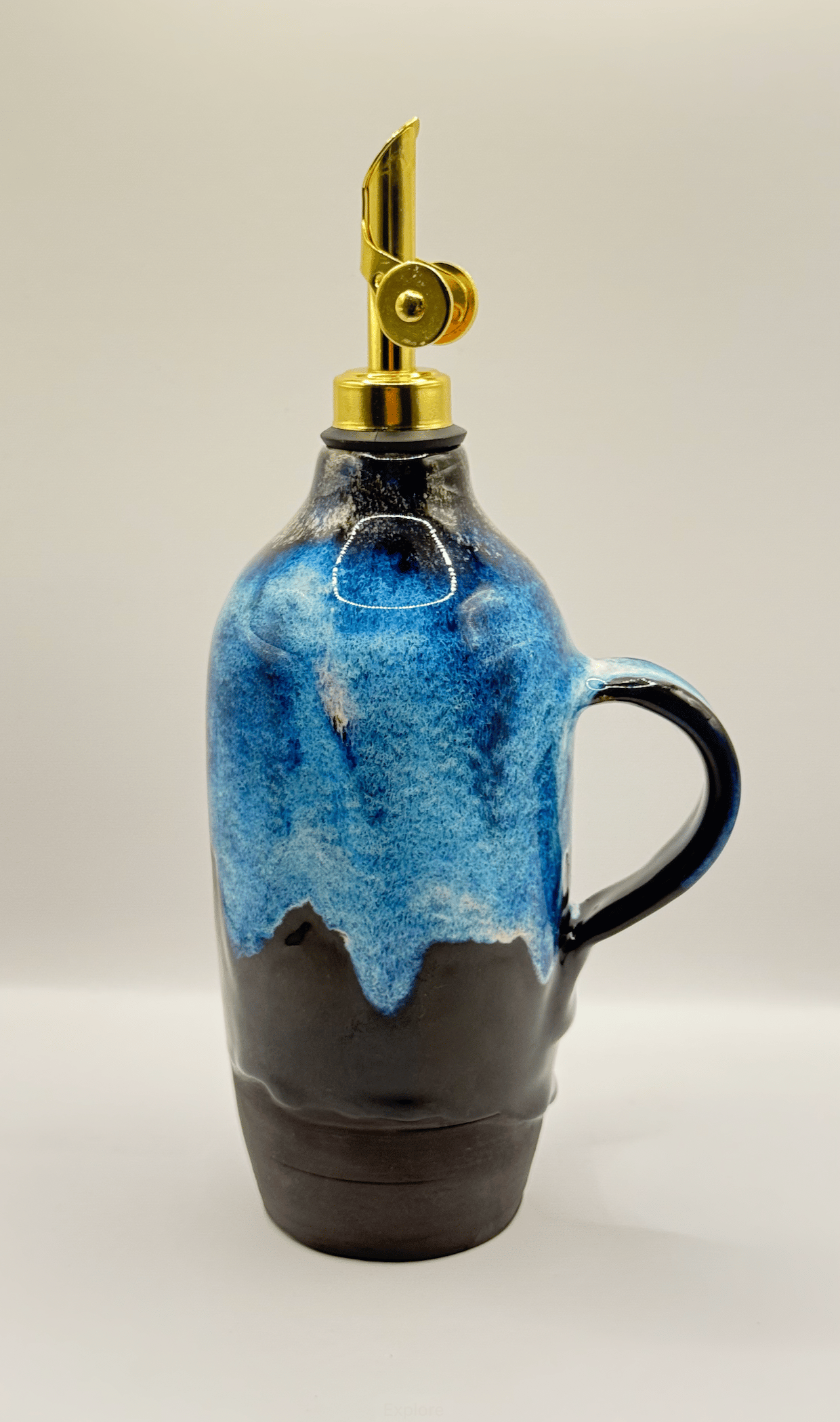 Glazed in deep indigo and stormy blue flowing over a dark clay base, this oil bottle captures the feeling of waves rolling in under moonlight. The Midnight Tide glaze pools and breaks in a dramatic contrast, and the golden pourer adds a polished finishing touch.