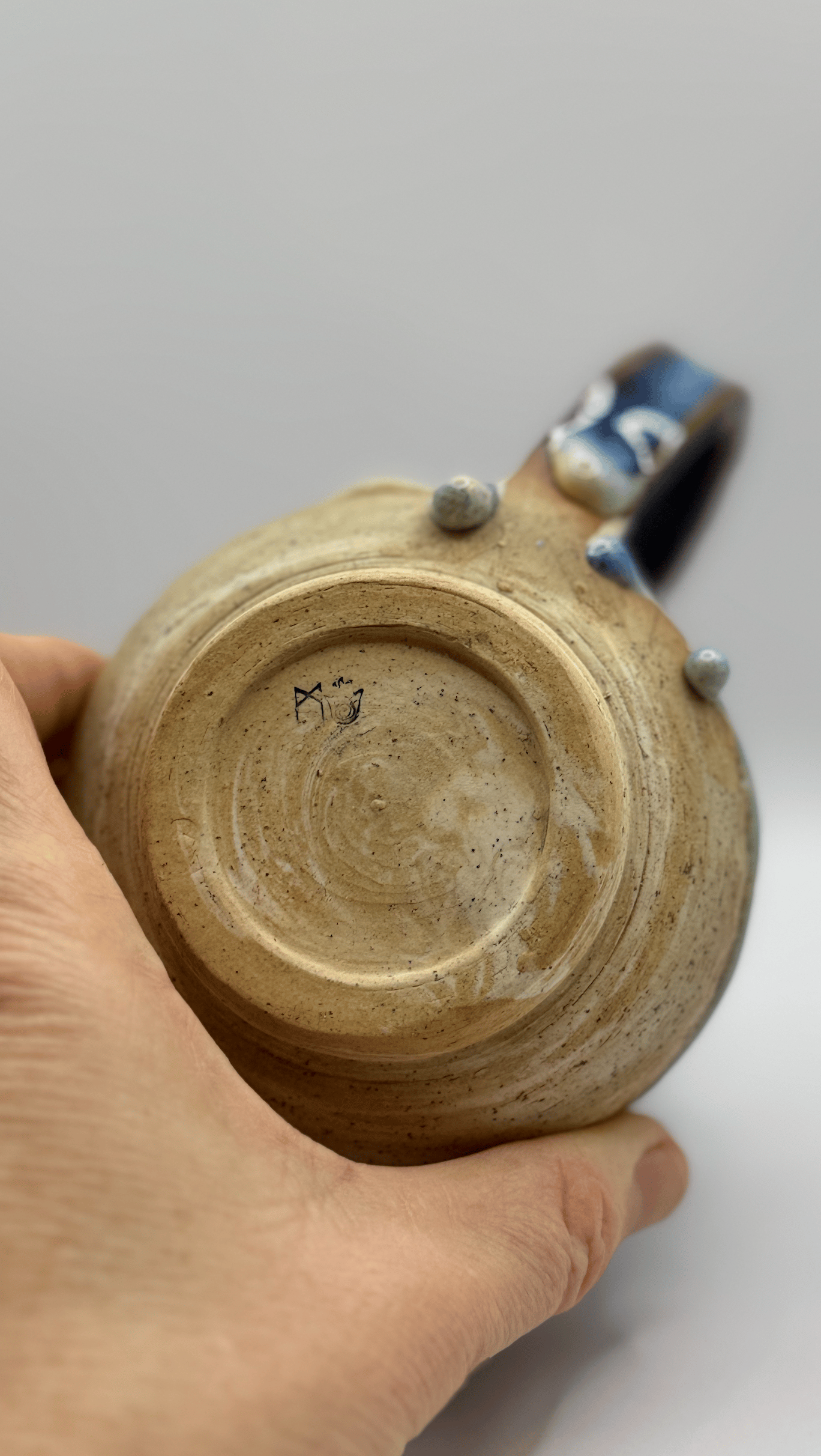 Like the deep colour of the ocean crashing on the sand late at night, Midnight Currents captures a dance of rich browns, cobalt blues, rich purples, tranquil aqua blues, and coastal ivory across an agateware speckled buff stoneware form. The glaze flows in fluid, organic layers and drips—each one evoking the ocean’s quiet rhythm. Shimmering golden flecks on the inside of the mug remind me of stars on a dark sea at night.